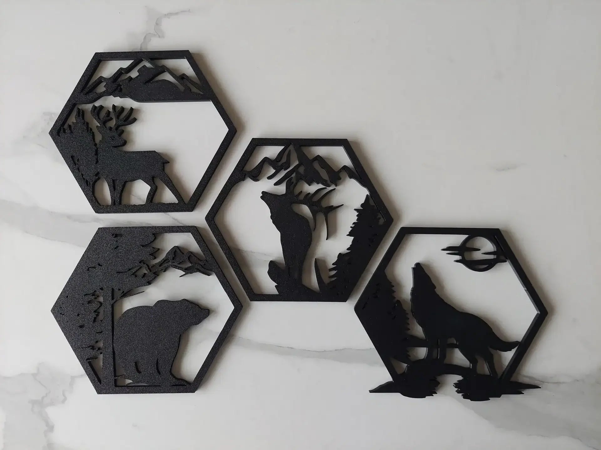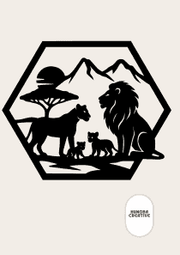 Wanddecoratie Leeuwenfamilie – Silhouet in Hexagon Frame – PLA – Zwart | Antraciet | Grijs | Wit – 175×151 mm
